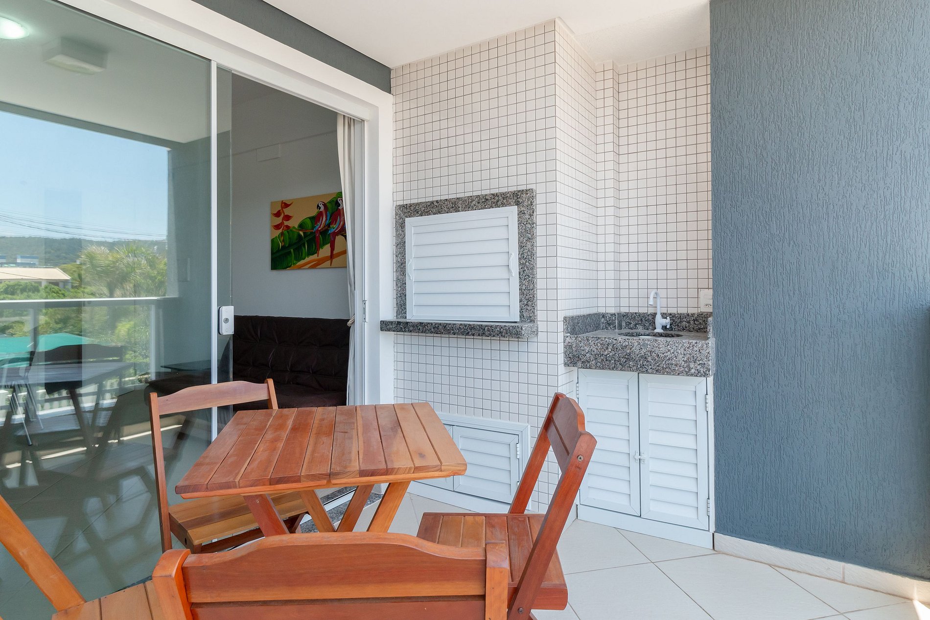 *Sacada com churrasqueira e vista lateral ao mar;