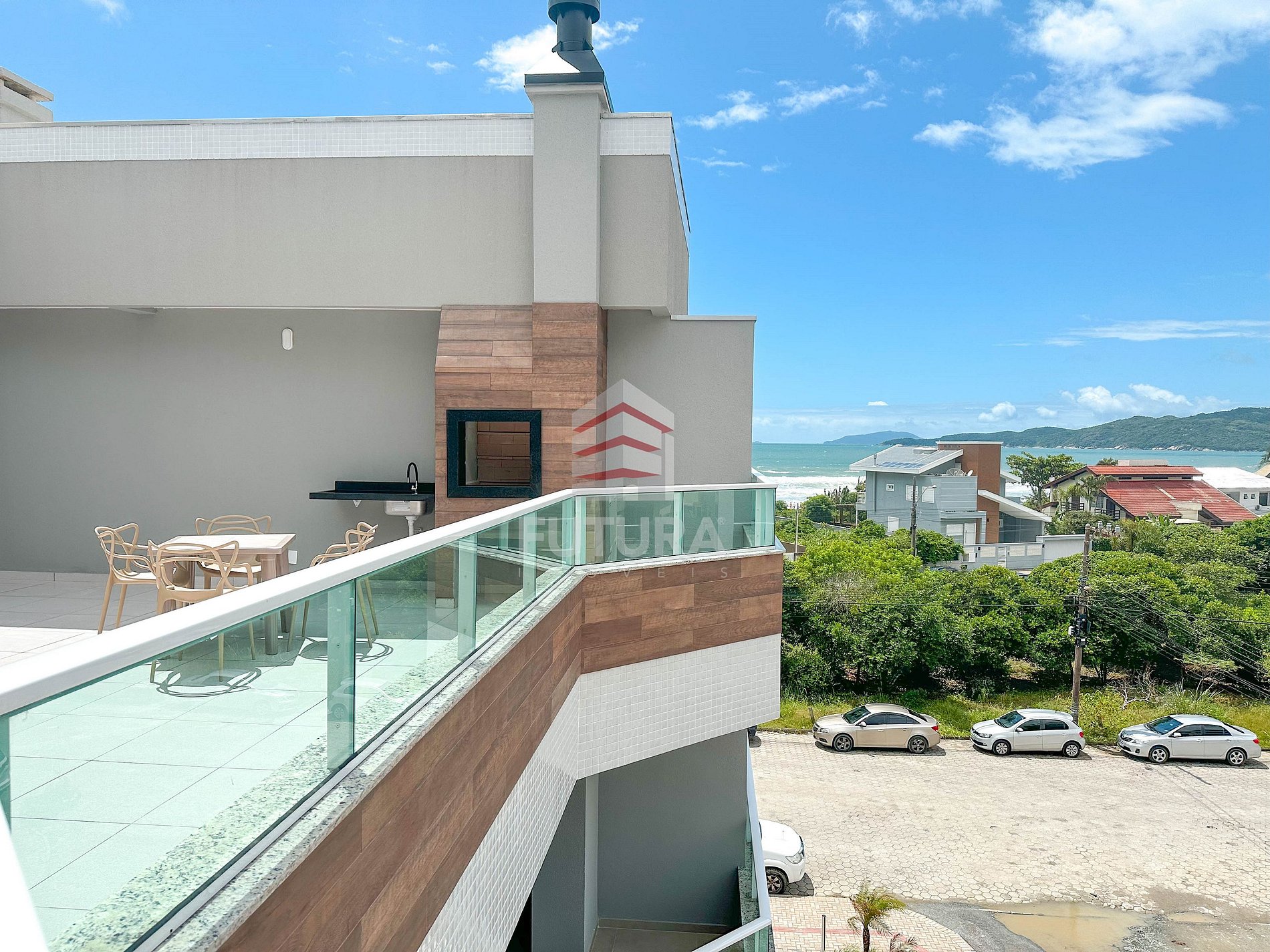 *Amplo terraço com churrasqueira e vista lateral pro mar;