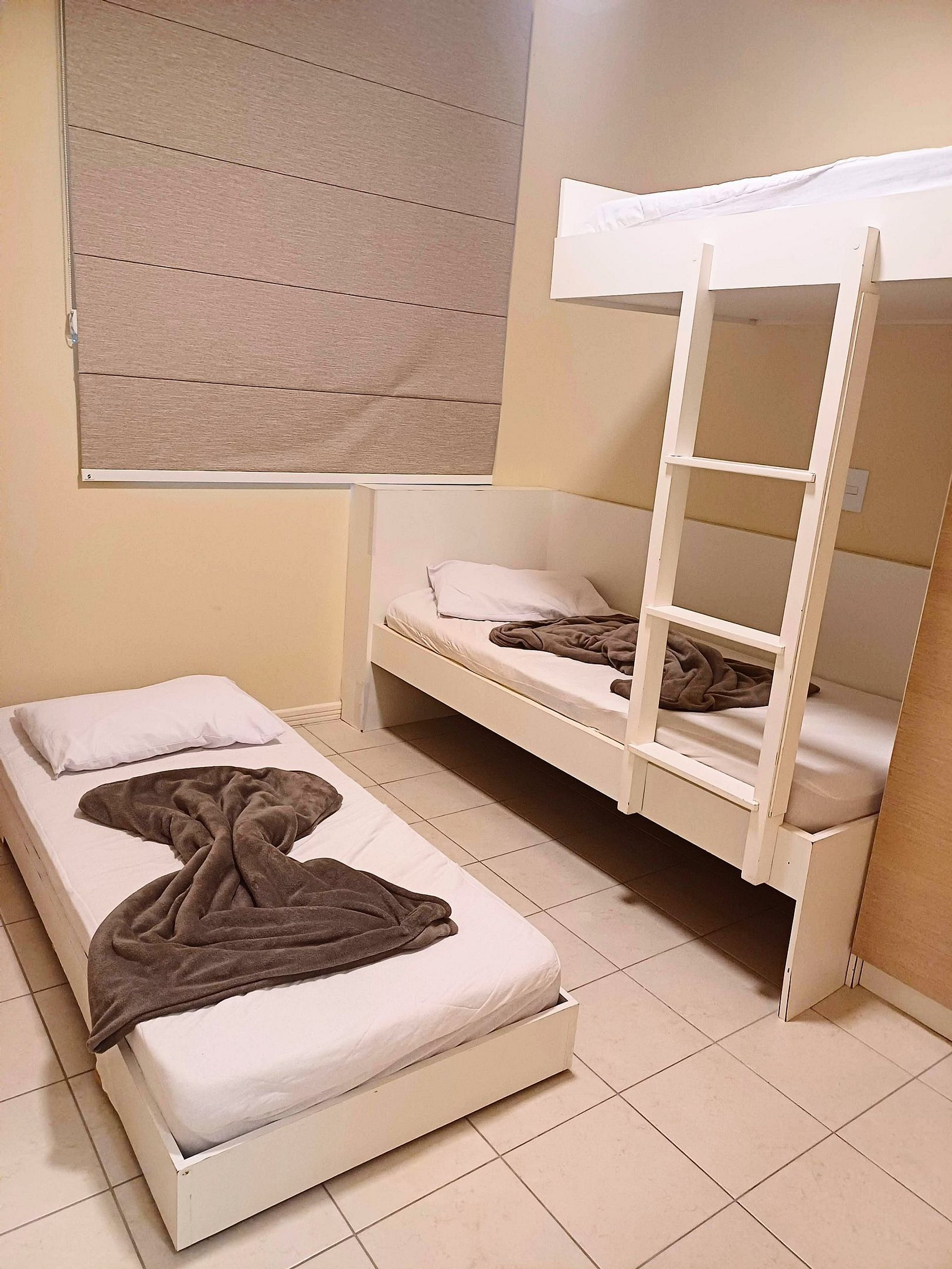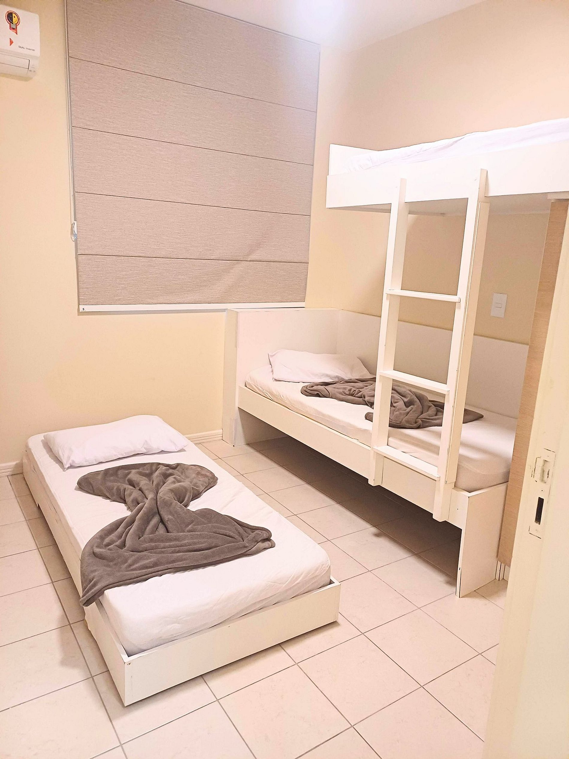 Um quarto com 1 cama de beliche e uma auxiliar e ar condicionado