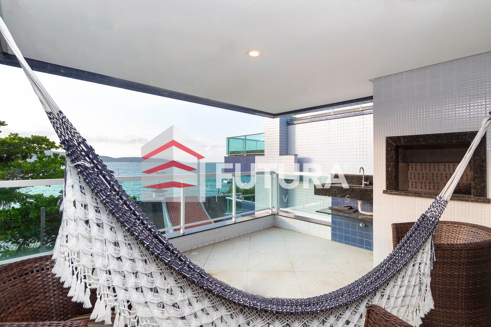 *Sacada de frente com churrasqueira e vista para o mar