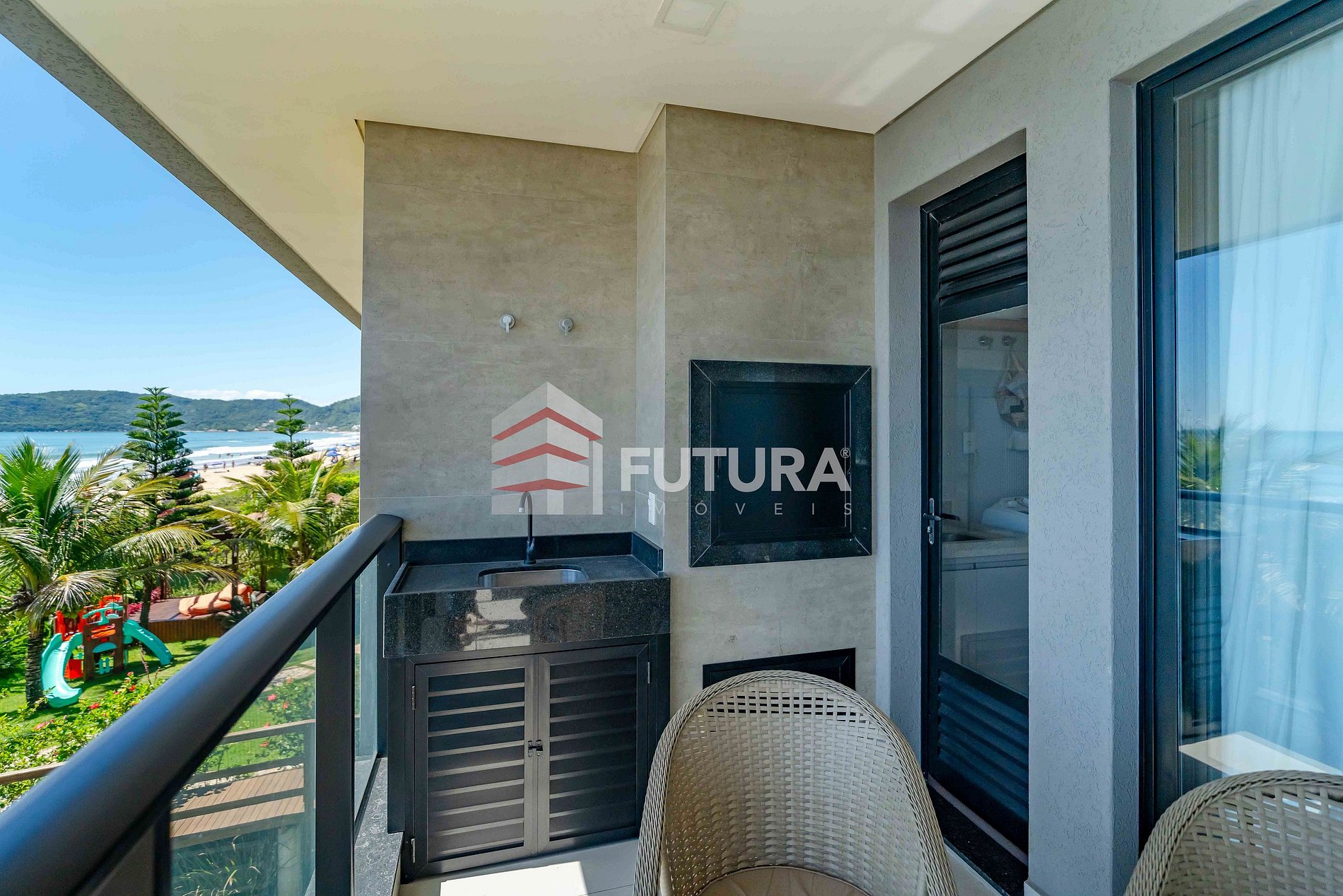 *Sacada com churrasqueira e vista mar.