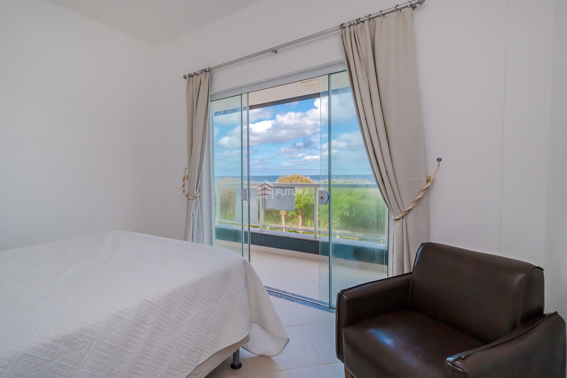 *Dormitório com duas camas de solteiro sendo uma com auxiliar + acesso a sacada e vista para o mar;