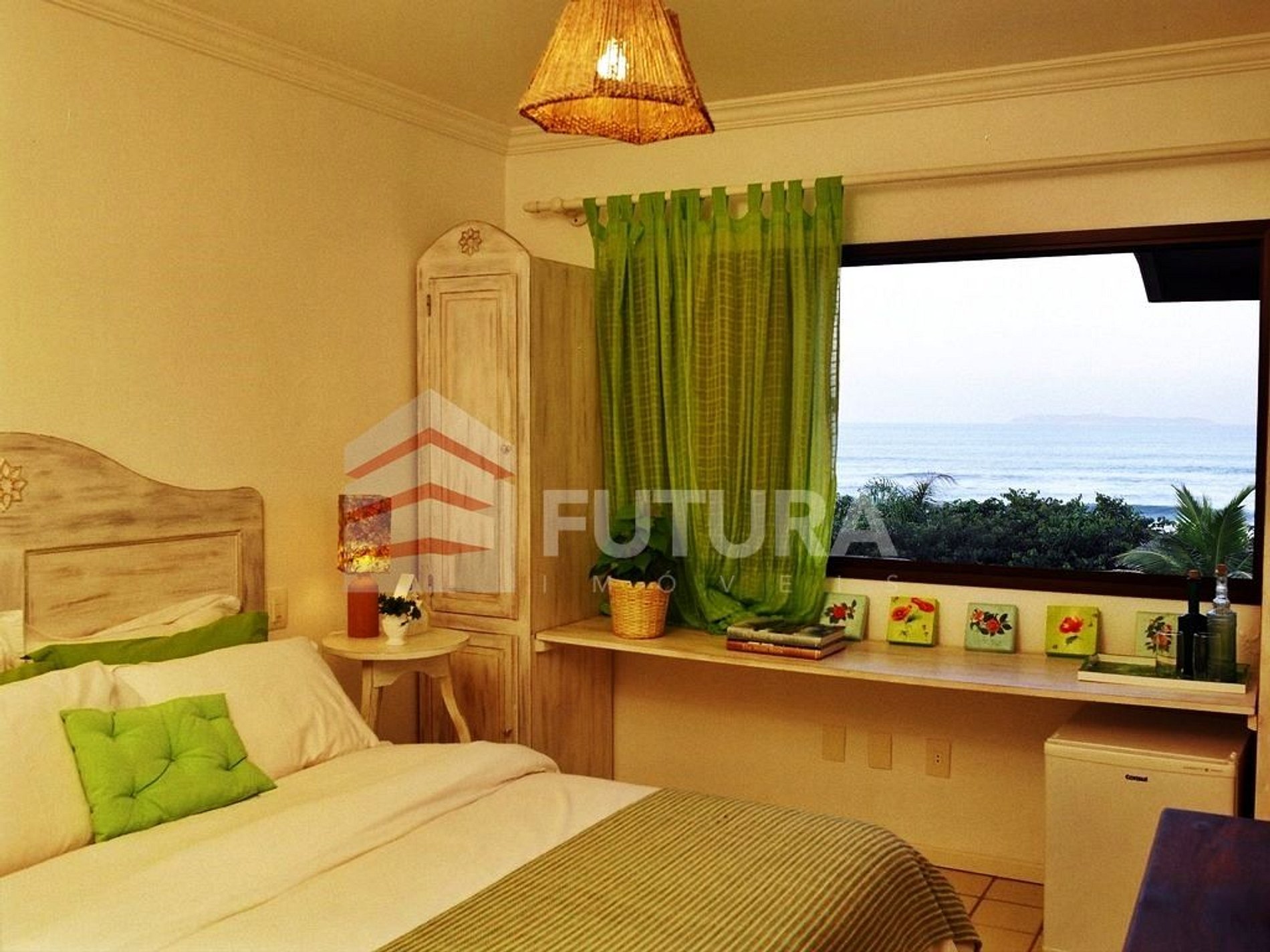 *01 suíte com cama de casal + 01 beliche + frigobar + ar condicionado e vista mar;