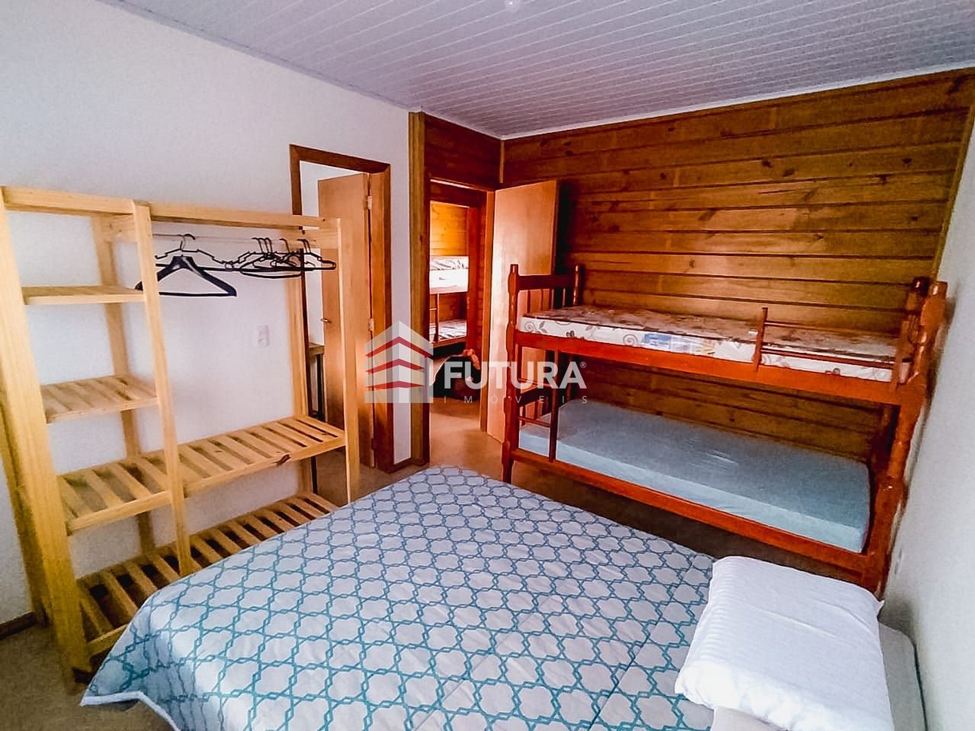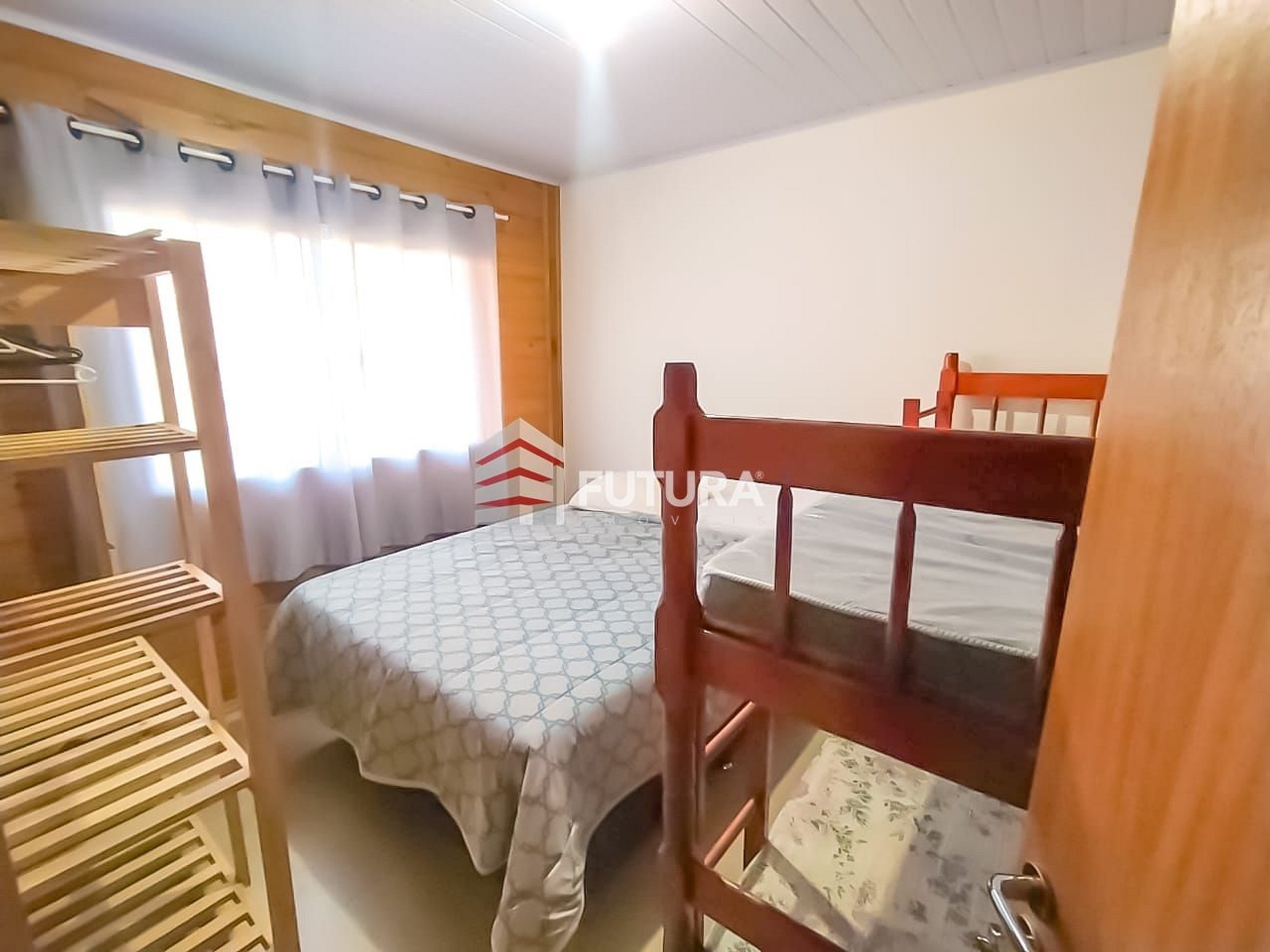 *01 dormitório com cama de casal + 01 beliche + ar-condicionado;