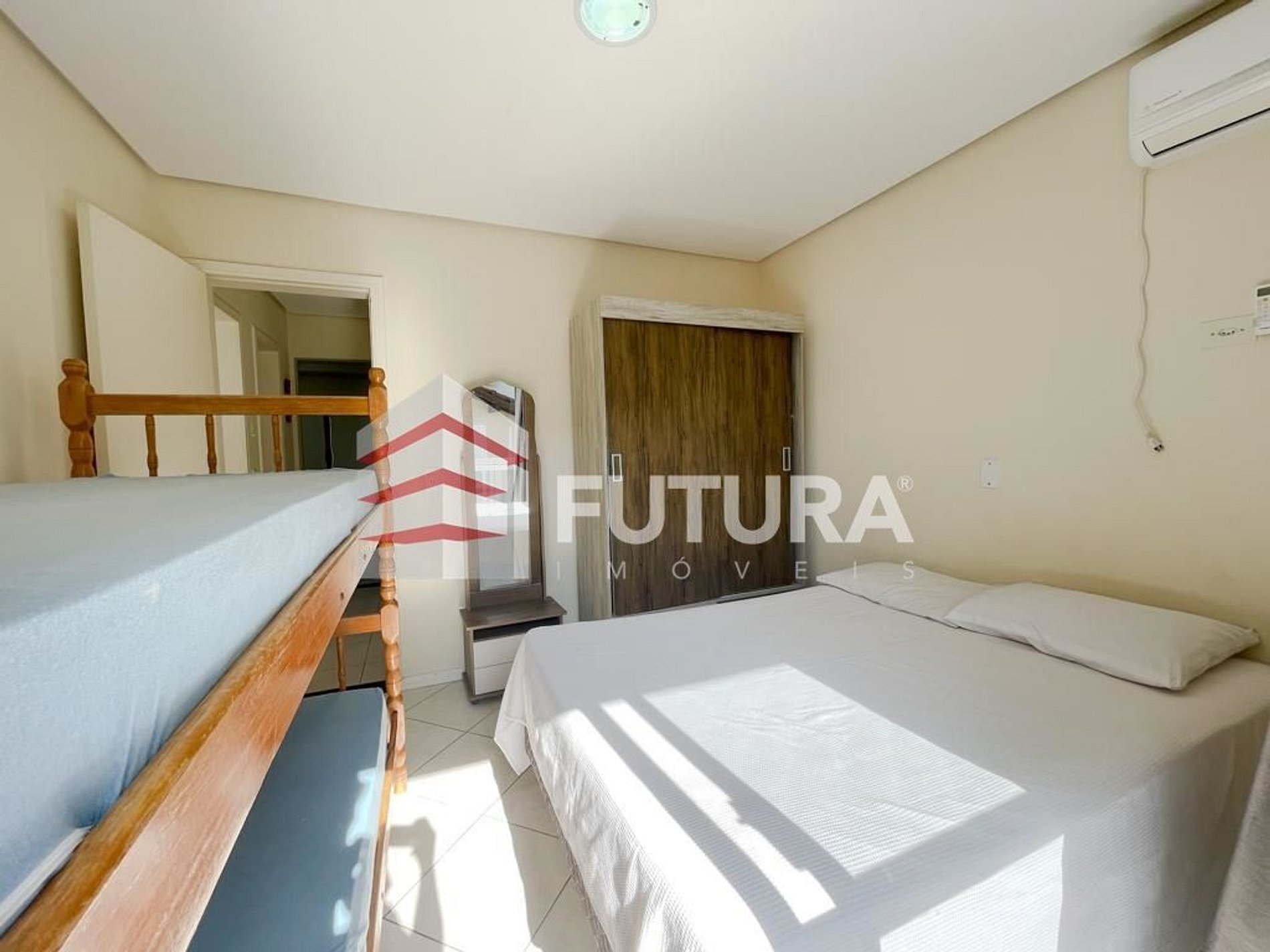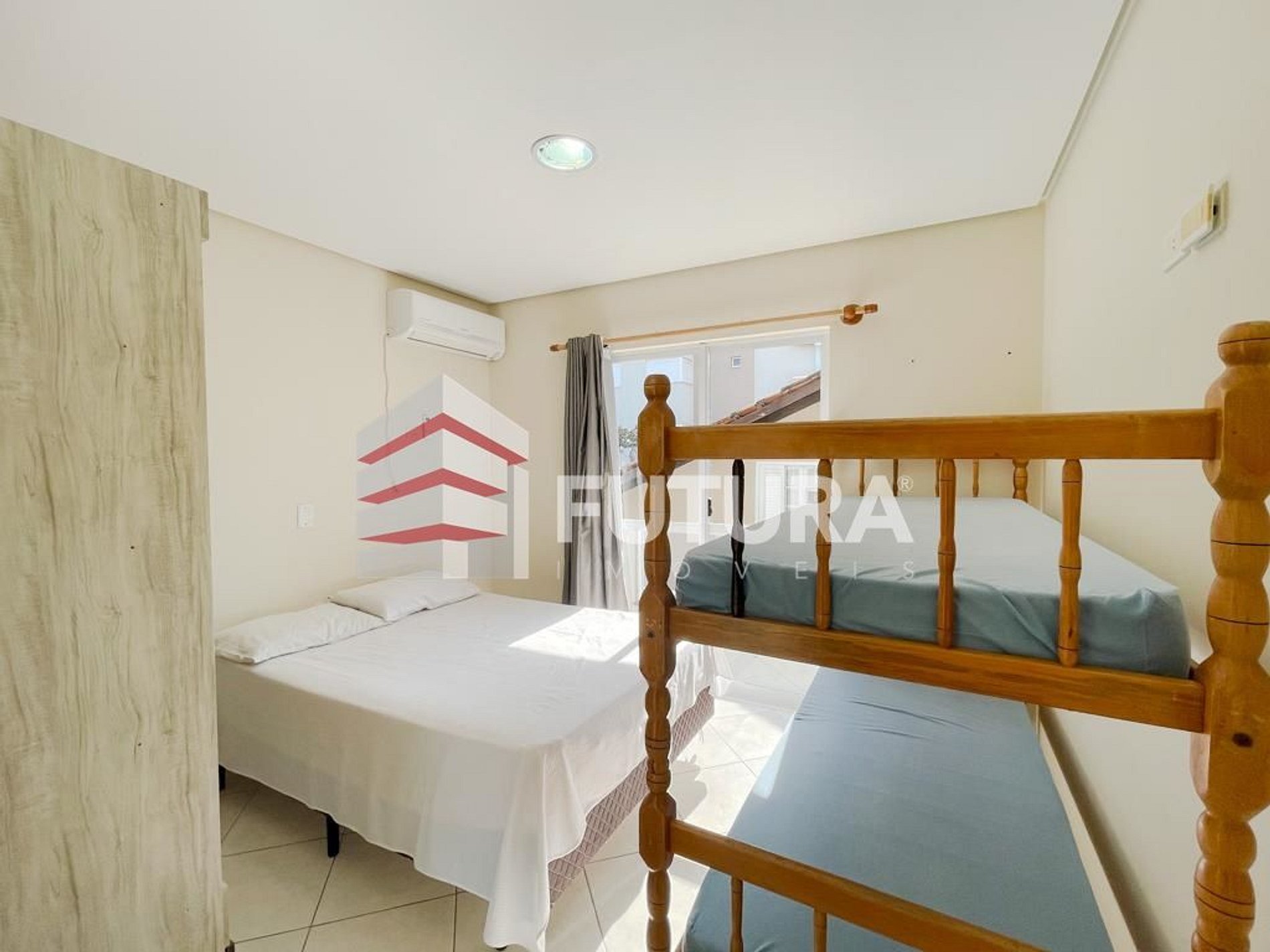 *01 dormitório com cama de casal e uma beliche, climatizada